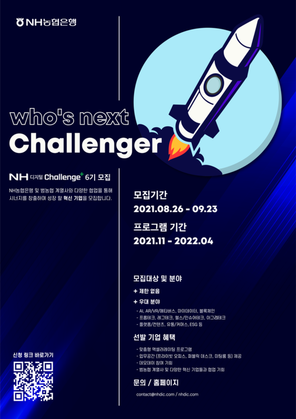 NH농협은행은 9월 23일 까지 혁신기업 육성·협업 프로그램 'NH디지털Challenge+' 6기를 모집한다고 26일 밝혔다.