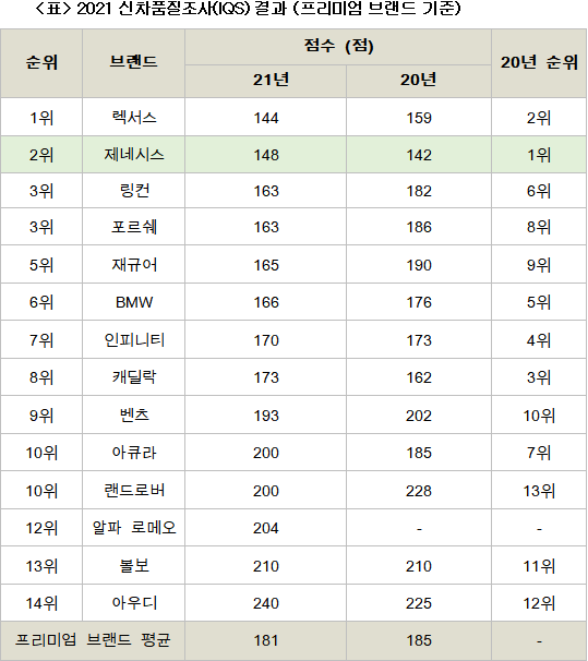 제네시스는 프리미엄 브랜드 평균(181점)은 물론 일반 브랜드까지 합한 전체 브랜드의 평균인 162점을 상회하며 처음 평가 대상에 선정된 2017년부터 5년 동안 꾸준히 프리미엄 브랜드 상위권을 유지했다.