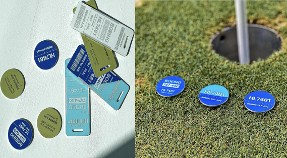 1일 항공업계에 따르면 대한항공은 보잉747-400(HL7461) 항공기로 제작한 네임택과 골프공 위치를 표시하는 볼마커를 출시한다. 내일부터 대한항공 홈페이지 내 마일리지 몰에서 한정수량으로 판매된다. 공제 마일리지는 아직 확정되지 않았으나 2700마일 수준으로 거론되고 있다.