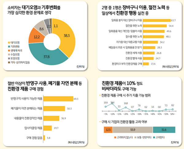 소비자의 친환경 소비 인식 부분에서는 일상에서 친환경 행동을 가장 잘 실천할 수 있는 분야로 소비·교통·교육·주거·직장 분야 중 응답자의 50%가 세대별 상관없이 실천이 용이한 '소비' 분야를 꼽았다. 또한, 응답자의 3분의 1은 '제품 구매 시 기업의 친환경 활동 여부'를 고려한다고 답했고, 54%는 '친환경 제품 구매 시 10% 이내 추가 비용을 낼 의향이 있다'고 답했다.