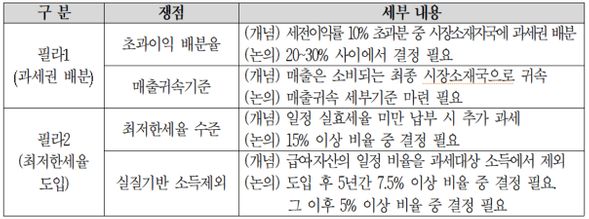 이동훈 법무법인 율촌 미국회계사는 ‘디지털세 도입시 한국 기업 영향’ 발표에서 “과세권 배분을 내용으로 하는 ‘필라1’은 매출 27조원 및 세전이익률 10% 이상 기업이 대상이기 때문에 이를 충족하는 국내기업은 삼성전자와 SK하이닉스 2개에 불과하지만 최저한세율 15%를 도입하는 내용의 ‘필라2’는 매출 기준이 ‘1조원 이상’으로 낮기 때문에 다수의 한국 기업이 포함될 것"이라고 설명했다.