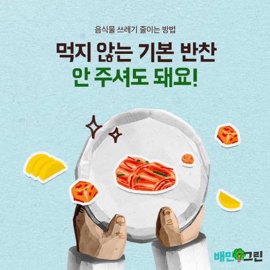 권용규 우아한형제들 가치경영실장은 "이번 캠페인으로 음식물 쓰레기를 줄이는 효과뿐 아니라, 기본찬을 담는 작은 플라스틱 용기 사용도 줄일 수 있을 것으로 기대한다"고 말했다.