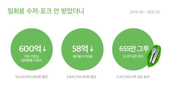 그 결과 일회용품을 받지 않는 비율은 지난해 6월 15.8%에서 지난 6월 73%까지 늘었다. 올 7월 기준 '일회용 수저포크 안 받기' 참여자는 누적 1402만명에 달한다. 이 기능을 통해 아낀 일회용품은 소나무 655만 그루를 심은 효과와도 맞먹는 것으로 나타났다.