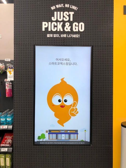#. 체크카드를 밀어넣고 입장을 위한 인증을 마치자 매장문이 열린다. "어서오세요, 스마트코엑스점 입니다." 인사말이 스피커를 통해 나온다. 매장 천장 곳곳에 달린 카메라는 고객의 행동을 빠르게 인식한다. 지능형 사물인터넷(IoT)이 탑재된 진열대는 물건 무게를 감지한다. 카메라는 매서운 눈을 가졌다. 매일 스스로 상품 이미지를 습득할 정도로 영리하다. 물건에 부착된 바코드 정보도 이미 서버에 저장돼 있다. 고객이 얼마짜리 상품을 집어들었는지도 금세 알아차린다. 생수 한 병을 들고 출구를 나온 순간, 입장 때 내민 체크카드를 통해 결제가 완료됐다.