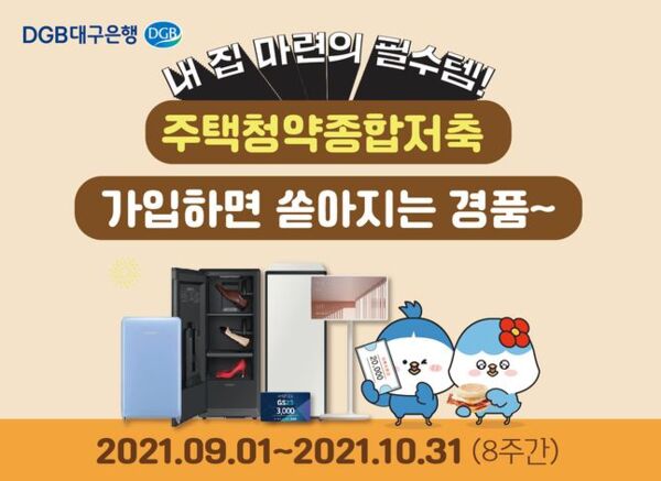 DGB대구은행은 오는 10월31일까지 2개월간 주택청약종합저축 가입 장려를 위해 최신 디지털 트렌드를 반영한 가전 제품 및 기프티콘을 제공하는 경품 이벤트를 실시한다고 밝혔다.