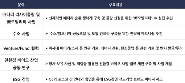 GS 관계자는 "두 그룹이 보유한 벤처 투자 인프라를 활용한 2차전지 및 수소 분야 유망기업 공동발굴, 주요 사업장 탄소저감 활동 추진 등 ESG 경영을 포함해 폭넓은 분야에서 협력할 것"이라며 "두 그룹 경영진이 협의한 내용을 바탕으로 실무진 협의를 통해 실질적 성과를 낼 것"이라고 말했다.