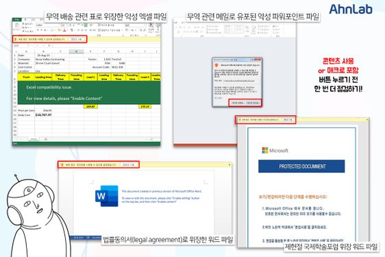 지난 7월 발견된 무역 배송 관련 표로 위장한 엑셀 파일의 경우 파일 내에 '엑셀 호환 이슈'라는 문구와 함께 '자세한 내용을 보려면 '콘텐츠 사용' 버튼을 누르세요'라는 내용을 포함해 사용자를 속이고자 했다.