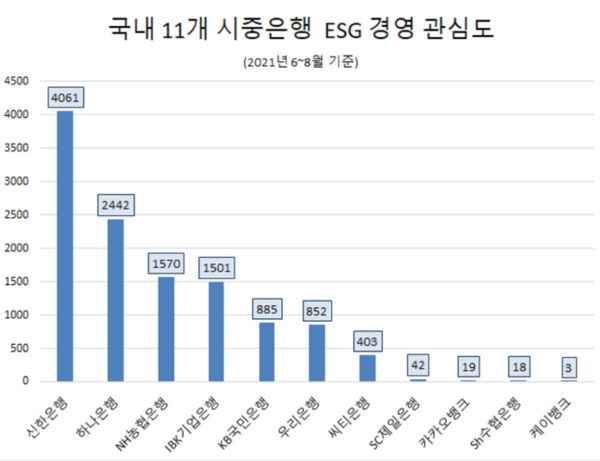 국내 11개 시중은행을 대상으로 올 6~8월 'ESG 경영'에 대한 빅데이터 정보량(온라인 포스팅 수)을 분석한 결과 신한은행이 가장 많은 것으로 나타났다.