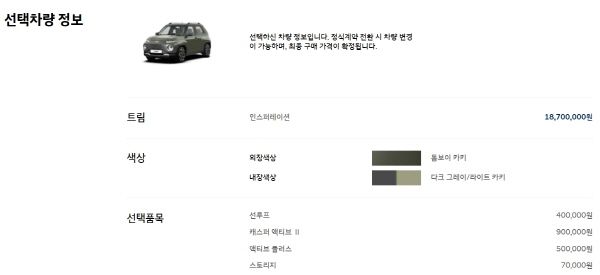 사전계약 방법은 간단했다. 구매할 차량의 트림(스마트, 모던, 인스퍼레이션)을 정하고, 내장 및 외장 색상, 선택품목(옵션), 탁송지를 결정한 후 10만원의 계약금을 결제하면 된다. 결제 방식은 카드, 무통장 입금 중 하나를 선택하면 된다.