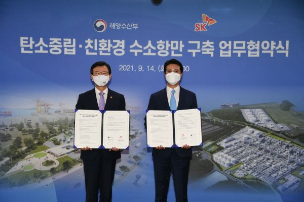 SK는 14일 정부세종청사에서 해양수산부와 ‘탄소중립·친환경 수소항만 생태계 구축 업무협약’을 체결했다.