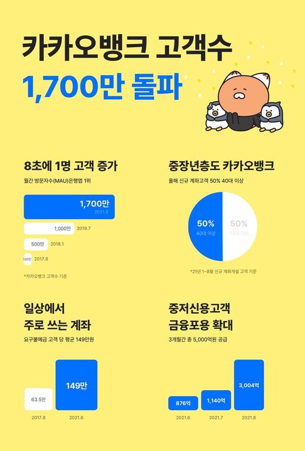 또한 카카오뱅크 고객 1700만 명은 대한민국 국민의 33%로 '3명 중 1명'이 카카오뱅크를 이용하고 있다고 볼 수 있다.