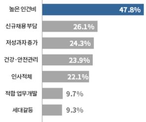 중장년 인력관리에 어려움이 있다고 응답한 기업이 가장 많이 꼽은 것은 ‘높은 인건비’(47.8%)에 이어 ‘신규채용 부담’(26.1%), ‘저(低)성과자 증가’(24.3%), ‘건강·안전관리’(23.9%), ‘인사 적체’(22.1%) 순이었다. ‘적합 업무개발’(9.7%), ‘세대갈등’(9.3%)이라고 응답한 기업도 일부 있다.
