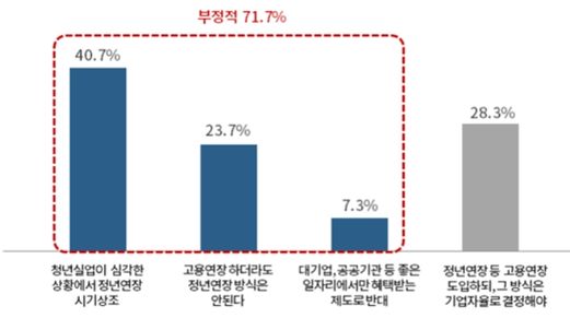 구체적으로 ‘청년실업이 심각한 상황에서 정년연장은 시기상조’라는 응답이 40.7%, ‘고용연장을 하더라도 정년연장 방식은 안된다’가 23.7%, ‘대기업 공공기관 등 좋은 일자리만 혜택받는 제도이므로 반대한다’가 7.3%로 나타났다. 부정적으로 답변하지 않은 28.3% 역시 ‘고용연장을 도입하되 그 방식은 기업별 자율로 결정해야 한다’는 의견이다.