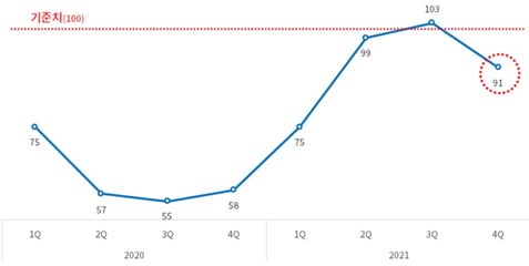업종별로는 코로나 확산과 유가 상승에 직면한 ‘정유·석화(82)’를 비롯 ‘조선·부품(87)’, ‘자동차·부품(90)’ 업종이 낮았다. 반면 코로나 특수가 계속되는 ‘의료정밀(110)’과 중국시장 회복 영향을 받는 ‘화장품(103)’ 업종은 높게 나타났다.