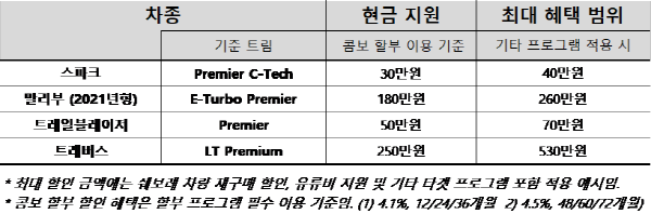 트래버스와 말리부 구매 고객에게는 36개월 무이자 할부 혜택을 제공한다. 할부와 현금 지원이 결합된 콤보 할부를 적용하면 트래버스 250만원, 말리부 180만원의 현금 지원 혜택을 받아볼 수 있다.