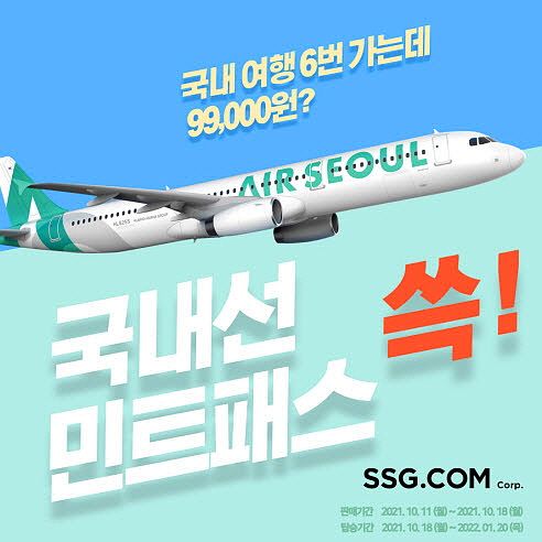 SSG닷컴은 11일 오전 9시부터 18일까지 주중 정기 항공권 ‘에어서울 민트패스’ 2종을 단독 판매한다고 10일 밝혔다.