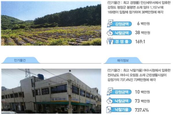 캠코 관계자는 "코로나19 이후 압류재산 매각 유예 등으로 전년동기대비 입찰건수는 다소 감소했으나 공매에 대한 관심이 많아지면서 낙찰건수·낙찰률은 상승했다"며 "입찰준비 기간이 포함된 상반기에 비해 하반기 실제 입찰에 부쳐지는 건수가 증가해 7~11월 입찰물건도 늘어날 것으로 보인다"고 말했다.