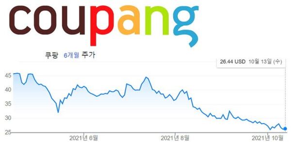 14일 이커머스업계와 자본시장에 따르면 올해 3월 11일(현지시간) 49.25달러(시초가)로 미국 뉴욕 증시에 상장한 쿠팡 주가는 30달러를 밑돌며 추락세를 기록 중이다. 13일 쿠팡은 26.44달러로 거래를 마쳤다. 이같은 하락세는 대주주 의무보호예수 기간 마감에 따른 경영진의 주식 매도와 적자 지속이 겹치면서 주가는 상장 이후 최저가를 향하고 있다.