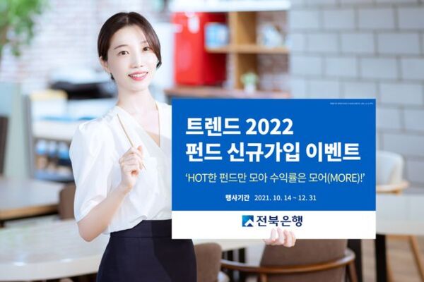 JB금융그룹 전북은행이 14일부터 전북은행에서 펀드를 가입한 고객들을 대상으로 '트렌드 2022 펀드 신규가입 이벤트'를 실시한다.