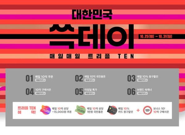 이번 행사의 백미는 SSG닷컴이 준비한 트리플 텐(10)' 프로모션이다. 숫자 '10'과 관련한 세 가지 할인 혜택을 선보인다는 점에서 '트리플 텐'이라는 이름을 부여했다. 사전행사를 포함한 전체 쓱데이 행사 기간 내내 관련 혜택을 제공한다.