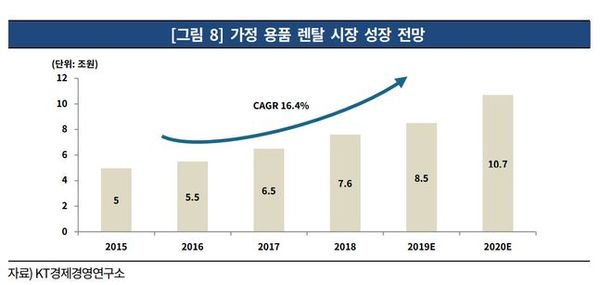 코웨이, 청호나이스 등 기존 선발주자를 뒤쫓아 LG전자, SK매직, 쿠쿠홈시스 등 후발업체가 렌털업에 뛰어든 것도 이런 이유에서다. KT경제연구소는 2020년 국내 렌탈시장 규모가 40조원에 육박할 것으로 전망했다. 이 중 개인 및 가정용품 렌탈시장 규모는 10.7조원으로 연평균 성장률(2016-2020) 18%의 고성장세를 달리고 있다고 진단했다. 2025년에는 전체 렌털 시장이 100조원까지 성장할 전망이다.