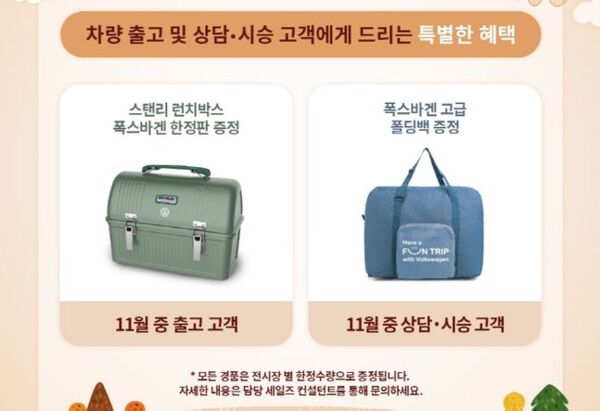 또한 11월 중 폭스바겐 차량을 출고한 고객에게는 선착순으로 폭스바겐 한정판 스탠리 런치박스를 제공한다.(한정수량/ 재고 소진 시 행사 종료)