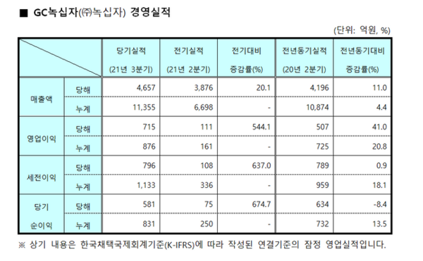 한편 GC녹십자의 올해 3분기까지 누적 매출액은 1조1355억원, 영업이익 876억원이다.