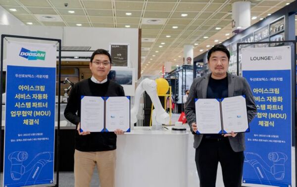 서비스 로봇 스타트업 라운지랩이 두산로보틱스와 협동로봇 솔루션 활성화 및 아이스크림 서비스 자동화 시스템을 위한 업무 협약(MOU)를 체결했다고 15일 밝혔다.