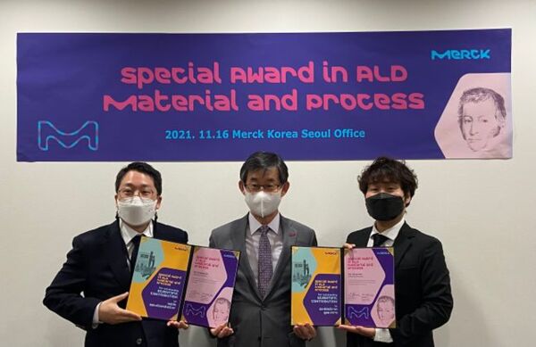 '머크 스페셜 어워드'는 차세대 전자기술을 위한 ALD(원자층증착) 소재 및 공정의 개선을 통해 기술적으로 크게 기여한 한국 한양대학교 신소재공학과의 박진성 교수와 재료화학공학과의 박태주 교수가 수상했다.