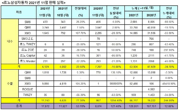 한편 르노삼성자동차는 반도체 등 부품 확보 노력의 성과로 빠른 출고가 가능해진 SM6, QM6, XM3 등 부산공장 생산 주력 차종을 중심으로 연말까지 내수 판매 증대에 총력을 기울일 예정이다.