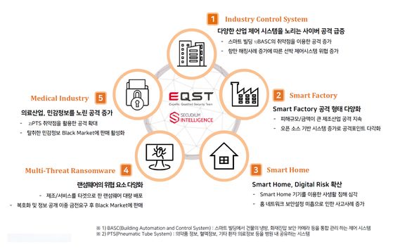 EQST가 전망한 5대 주요 보안 위협으로는 △다양한 산업제어시스템을 노리는 사이버 공격 급증 △스마트 팩토리 공격 형태 다양화 △스마트 홈, 디지털 리스크 확산 △랜섬웨어의 위협 요소 다양화 △의료산업, 민감정보를 노린 공격 증가 등이 포함됐다.