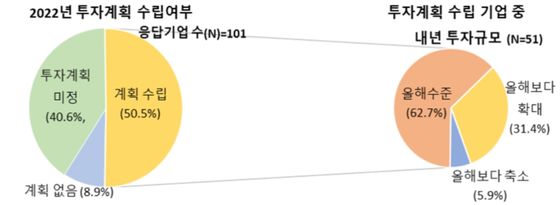 13일 한국경제연구원이 여론조사기관 모노리서치에 의뢰해 매출액 500대 기업을 대상으로 ‘2022년 투자계획’(101개사 응답)을 조사한 결과 응답기업의 49.5%가 "내년도 투자계획이 없거나(8.9%), 아직 계획을 세우지 못했다(40.6%)"고 응답했다.