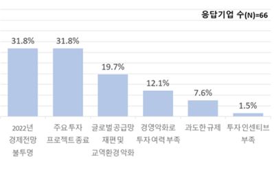 "내년 투자를 올해보다 늘리지 않겠다"고 응답한 기업들은 그 이유로 ▲2022년 경제 전망 불투명(31.8%) ▲주요 투자 프로젝트 종료(31.8%)를 가장 많이 꼽았다.