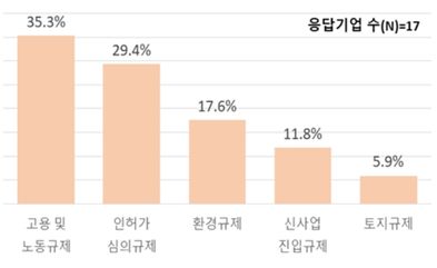 또한 ▲지자체의 인·허가 심의규제(29.4%) ▲환경규제(17.6%) ▲신사업 진입규제(11.8%) ▲공장 신·증축 관련 토지규제(5.9%)도 기업 투자환경 저해 요인으로 인식했다.