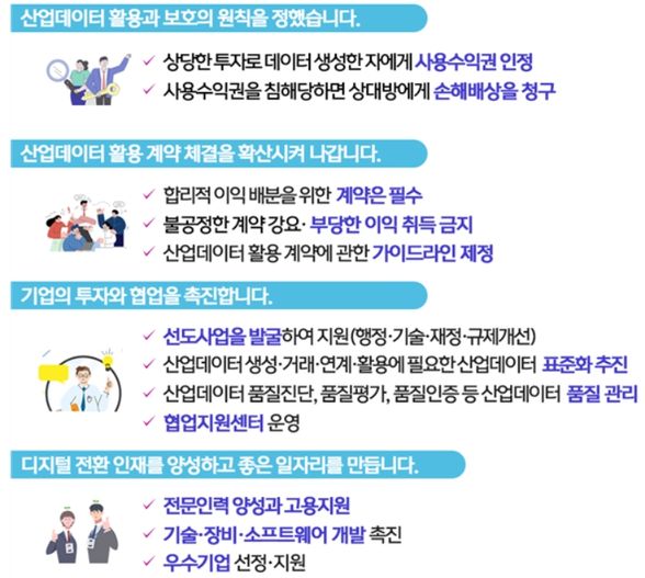 공포안은 인적 또는 물적 투자와 노력을 통해 산업데이터를 새롭게 생성한 자에게 이를 활용해 사용·수익할 권리를 부여하는 권리관계를 명확히 담았다. 당사자 간의 약정이 있는 경우를 제외하고 2인 이상이 공동으로 산업데이터를 생성한 경우 각자 권리를 갖고, 제3자에게 제공한 경우 생성한 자와 제3자 모두 권리를 갖도록 했다.