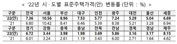 표준주택 공시가격의 시‧도별 변동률은 서울 10.56%, 부산 8.96%, 제주 8.15%, 대구 7.53% 순으로 상승률이 높고 광주(7.24%), 세종(6.69%), 전남(5.86%)의 경우 전년 대비 변동률이 감소했다.