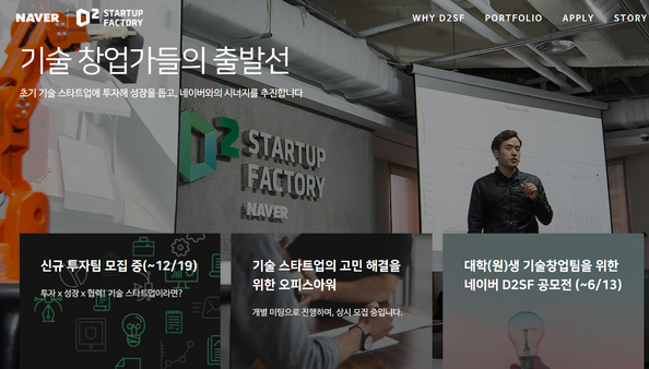 네이버 D2SF는 학생 창업팀 발굴 및 육성에도 나섰다. 현재 홈페이지를 통해 ‘캠퍼스 기술창업팀 공모전’을 접수 중이다. 선정된 팀에는 네이버 제2사옥 내 스타트업 전용 공간 또는 강남에 위치한 D2SF의 스타트업 거점 공간에 입주해 네이버 개발자들과 교류할 수 있는 기회가 제공된다.