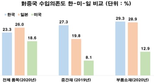 2020년 기준 전체 품목의 전 세계 對중국 수입의존도가 14.3%인 가운데 일본 26%, 한국 23.3%, 미국 18.6% 순으로 집계됐다. 부품소재는 한국 29.3%, 일본 28.9%, 미국 12.9% 순이다. 중간재는 2019년 기준 세계 평균이 10.4%인 가운데 한국 27.3%, 일본 19.8%, 미국 8.1% 순으로 나타났다.
