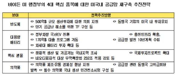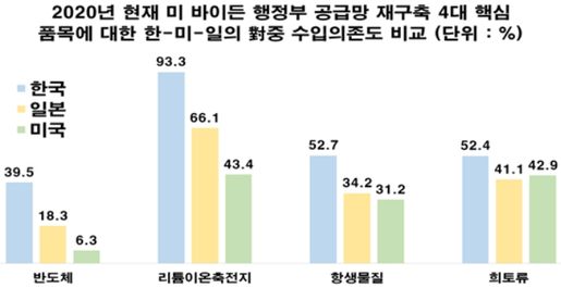 미국 바이든 행정부의 공급망 재구축 4대 핵심 품목인 배터리·반도체·희토류·바이오 분야 한국의 對중국 의존도가 위험 수준으로 진단됐다.