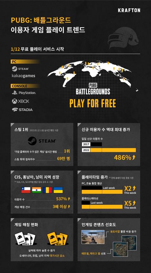 회사는 무료화를 통해 PUBG: 배틀그라운드 진입장벽이 낮아지고 접근성이 강화됐다고 보고있다. 2017년 출시 이후 흥행했던 시점과 견줄 만한 지표를 나타내고 있다는 설명이다.