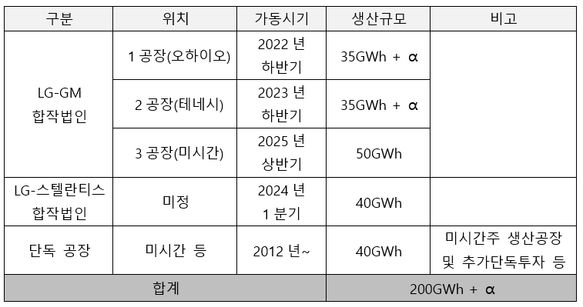 또한 LG에너지솔루션은 북미 내 추가 투자도 검토중이다. 단독 공장으로만 40GWh 이상 확보할 계획이다. 북미 고객사 합작법인과 단독투자를 모두 합하면 LG에너지솔루션의 북미 내 생산능력은 200GWh에 달한다.