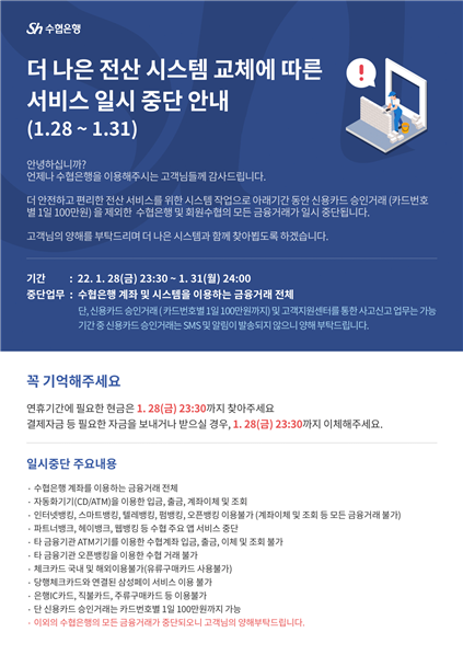 수협은행 관계자는 "전산 시스템 노후화에 따른 IT인프라 전면 교체 및 고도화 작업"이라며 "현금 입출금이나 결제자금 이체 등 금융거래가 필요한 고객은 반드시 28일 오후 11시 30분 전까지 마무리 해주시길 바란다"고 말했다.