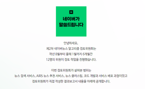 한편 네이버 뉴스 알고리즘 검증 작업은 이번이 두 번째다. 자사 뉴스 알고리즘에 대한 편향성 논란이 이어지면서 네이버는 외부 인사로 구성된 1차 검토위를 2018년 발족했다. 이후 약 6개월 간 검토 작업을 진행한 결과 "뉴스 추천, 검색 서비스에 적용되는 알고리즘과 학습 데이터 등을 검증한 결과 문제가 없다"고 발표한 바 있다.