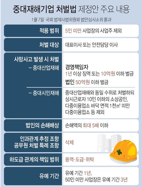 중대재해처벌법은 안전 조치 의무를 위반해 발생하는 인명피해를 예방하기 위해 제정한 법률이다. 안전사고로 노동자가 사망할 경우 사업주 또는 경영책임자에게 1년 이상의 징역이나 10억원 이하의 벌금을 부과하고 법인에게는 50억원 이하의 벌금이 부과되는 게 법의 핵심이다. 노동자가 다치거나 질병에 걸릴 경우에도 사업주가 7년 이상 징역 또는 1억원 이상 벌금에 처해진다.