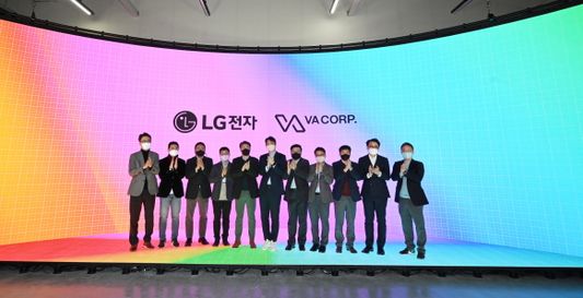 LG전자는 메타버스 플랫폼 업체 브이에이코퍼레이션과 함께 버추얼 프로덕션(가상 배경을 활용한 촬영기법) 수요에 대응하는 LED 사이니지를 개발한다고 8일 밝혔다. 양사 관계자들이 경기도 하남시에 위치한 브이에이스튜디오 하남(VA STUDIO HANAM) 내 LED 월로 조성된 가상 스튜디오에서 기념촬영을 하고 있다.