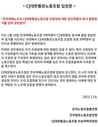CJ대한통운은 이날 입장문을 내고 "집단 폭행으로 인해 피해를 입은 우리 조합원들에게 사과하라"며 "이 시간 이후 동일한 사태가 발생할 경우 우리 노동조합은 결코 좌시하지 않을 것"이라고 경고했다.