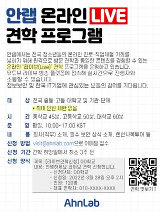 안랩은 22일 학생들의 진로·직업체험 기회 확대를 위해 전국 중, 고, 대학교 대상 온라인 라이브 견학 참가 신청을 받는다고 밝혔다.