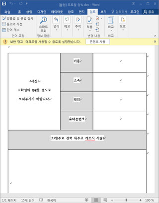 해당 악성 DOC 파일이 열리면 먼저 암호를 입력하는 과정을 거친 후에 이름, 소속, 직위, 휴대폰 번호와 사진 등을 입력하는 간략한 프로필 양식 화면이 나타난다.