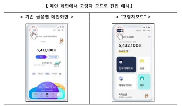 지침에 따르면 조회나 이체 등 은행별로 고령자의 이용빈도가 높은 기능은 전 과정 '고령자 모드'를 제공하게 된다. 고령자 모드는 직관적인 용어와 간결한 문장 사용, 일관성 있는 구조와 디자인, 충분한 작업 시간과 설명 제공, 한 화면 내 적정 수준의 정보 제공 등을 말한다.