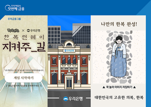 우리은행은 삼일절을 맞아 콘텐츠 플랫폼 방구석연구소와 함께 고객 참여형 SNS캠페인 '지켜주_길, 한복 런웨이'를 이달 31일까지 실시한다고 1일 밝혔다.